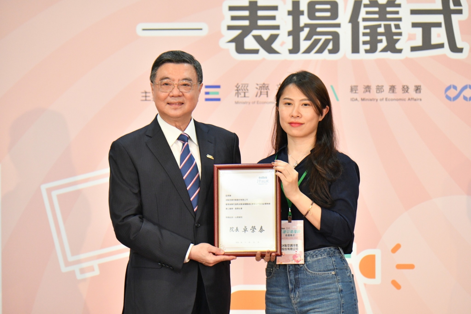 致詞結束後,卓院長分別頒發44張感謝狀予捐贈物資代表、調度物資業者及優惠方案業者,並偕同行政院季連成政務委員、李慧芝發言人、經濟部龔明鑫部長、產業發展署邱求慧署長及商業發展署蘇文玲署長等人合影留念。