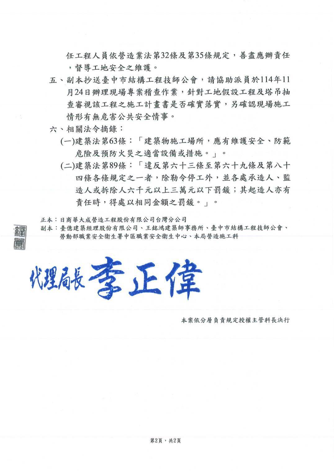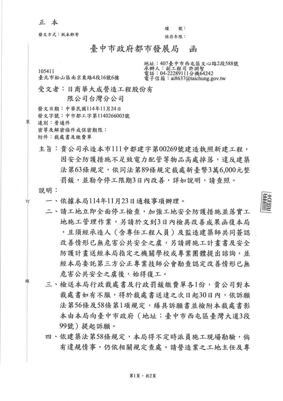 都發局說明,該建案領有台中市111中都建字第00269號建造執照,為地上33樓、地下9樓新建工程,起造人為臺億建築經理股份有限公司、承造人為日商華大成營造工程股份有限公司台灣分公司、監造人為王銘鴻建築師事務所,目前進度為地上14樓頂板勘驗。