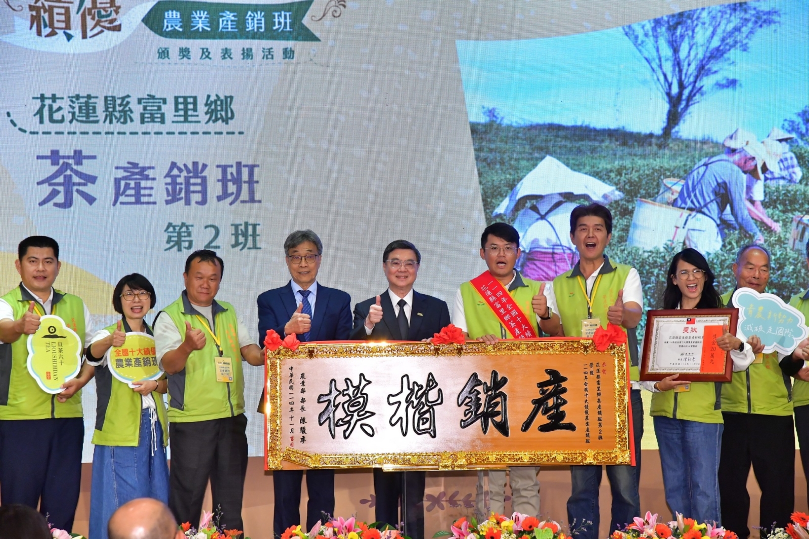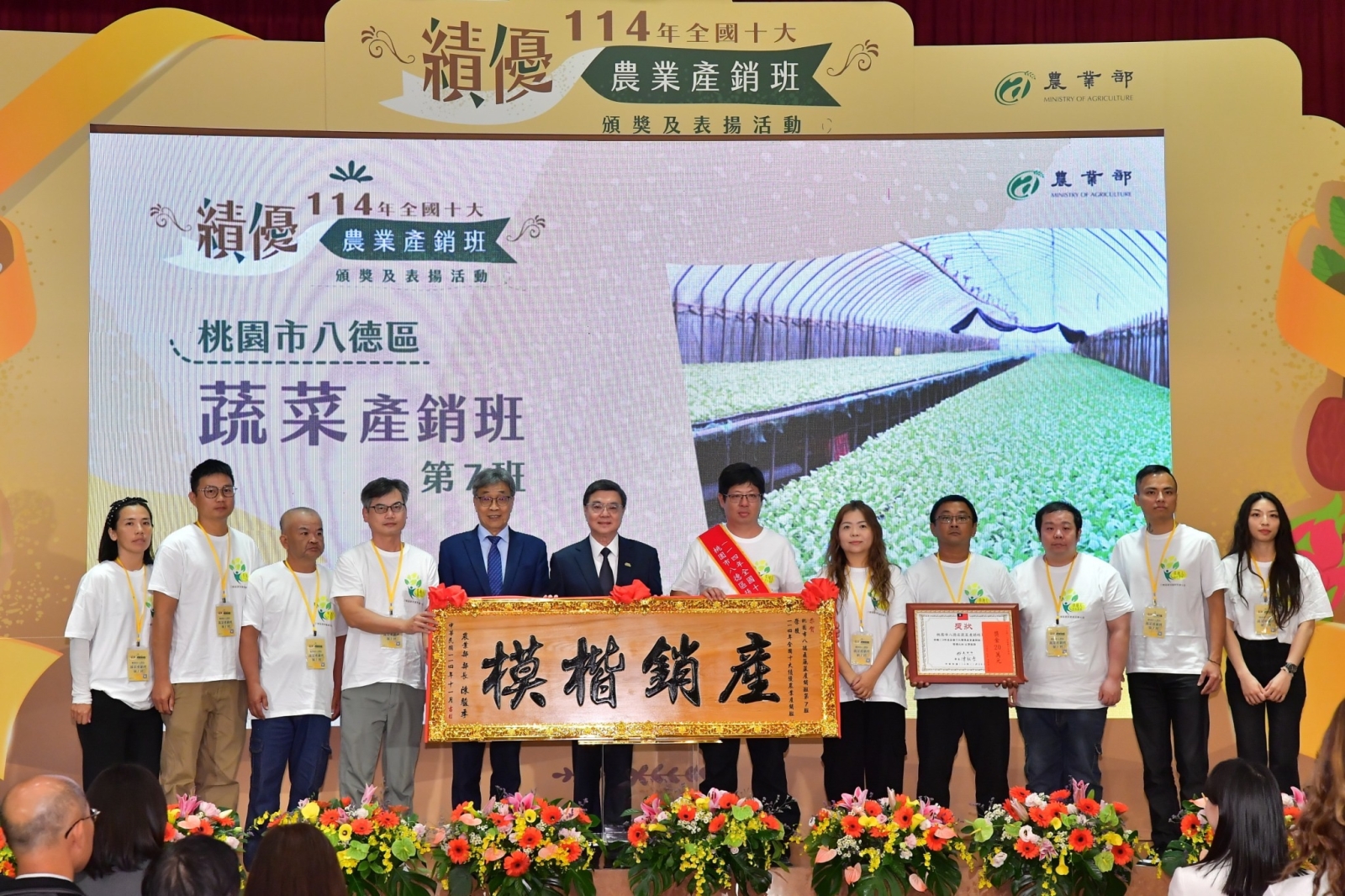 此行,卓院長首先觀賞績優產銷班事蹟影片,並於致詞結束後,頒發全國十大績優農業產銷班獎項,並與行政院李慧芝發言人、農業部陳駿季部長、謝衣鳯立委及10位獲獎產銷班班長合影留念。