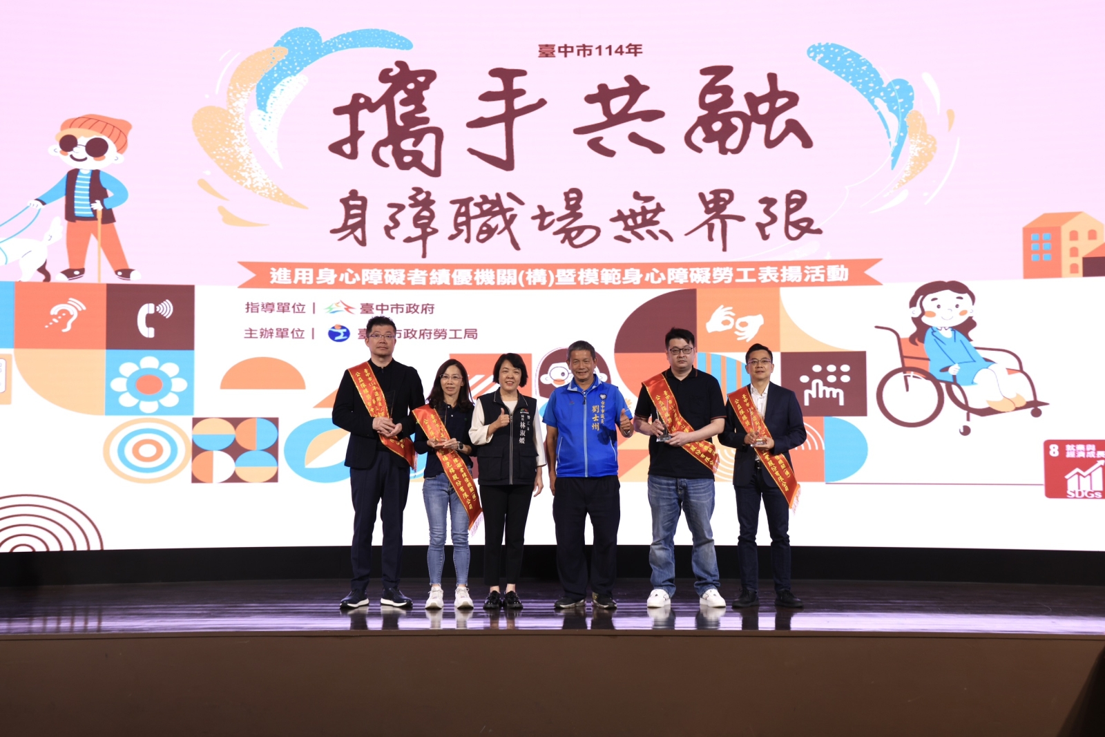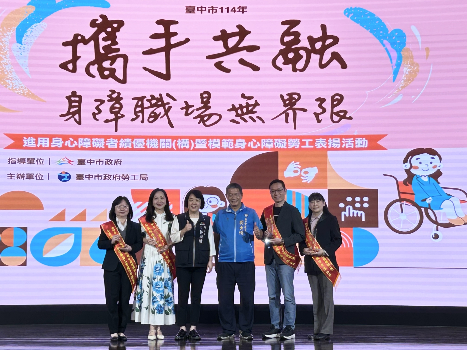 為鼓勵事業單位積極進用身心障礙者,並肯定身障朋友在職場上的堅持與貢獻,台中市政府勞工局於今(27)日舉辦「中市114年進用身心障礙者績優機關(構)暨模範身心障礙勞工表揚活動」,頒發包括楷模獎1名、優良事蹟獎10名、模範身心障礙勞工10名、公益採購獎10名,以及職場體驗友善廠商3名,共計34個單位及個人獲獎,場面溫馨感人。
