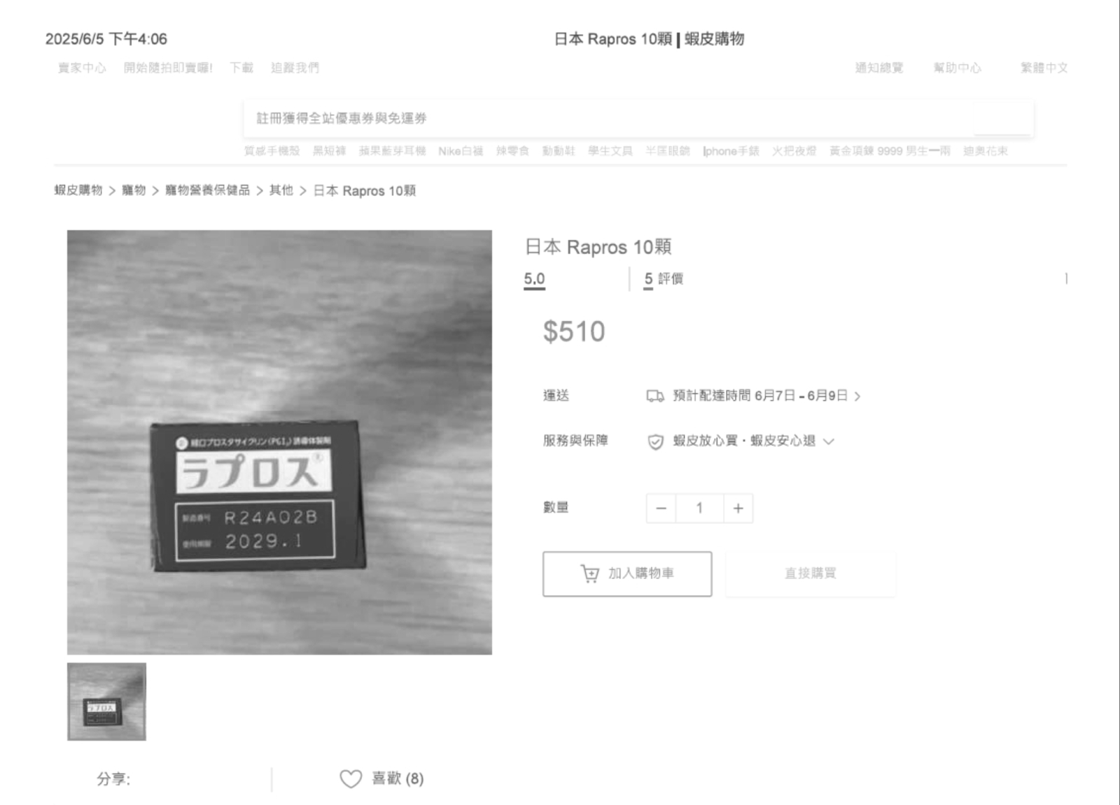 動保處今年已接獲4起違法案件,違規通路涵蓋了多元網路平台及實體店面。其中有業者於LINE社群,以團購模式刊登販售如「心疥爽」、「碩騰寵愛PLUS(貓)」等動物用藥品;另有賣家利用Facebook粉絲專頁,並串聯LINE社群進行「滴即樂」、「蚤不到」等藥品的宣傳與販售;此外,亦有民眾在網路電商平台iOPEN Mall上刊登販售動物用藥品「犬新寶」;以及實體店面藥局未經許可,現場販售動物用藥品「壁逃逃-S」。根據「動物用藥品管理法」規定,所有動物用藥品販賣業者皆應向所在地主管機關申請並經審查合格,才能核發許可證登記營業。無論是網路銷售或未經許可的實體店面販售,皆屬違法行為。