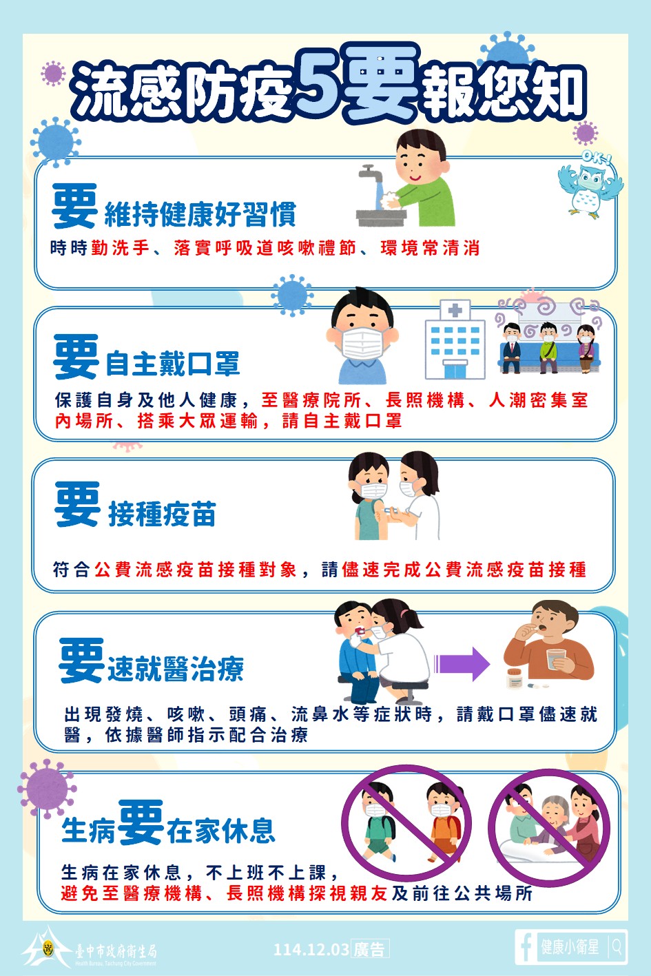 衛生局長曾梓展表示,目前國內社區主要流行的呼吸道病原體為流感A型H3N2,鄰近國家如日本、韓國及中國的流感疫情也同步上升,加上年底活動頻繁,更需提高警覺。他呼籲民眾至人潮聚集地時務必自主佩戴口罩,落實手部衛生與咳嗽禮節,身體不適請在家休息不上班、不上課,以減少傳播。符合公費疫苗接種資格的民眾,可透過台中市疫苗預約平台(https://gov.tw/hhv)預約,或至合約院所採非平台方式預約(https://gov.tw/giV),盡速接種疫苗,提高保護力。台中市共有647家公費流感抗病毒藥物合約院所,目前儲備量充足,若出現症狀應儘速戴口罩就醫並依照醫囑治療。