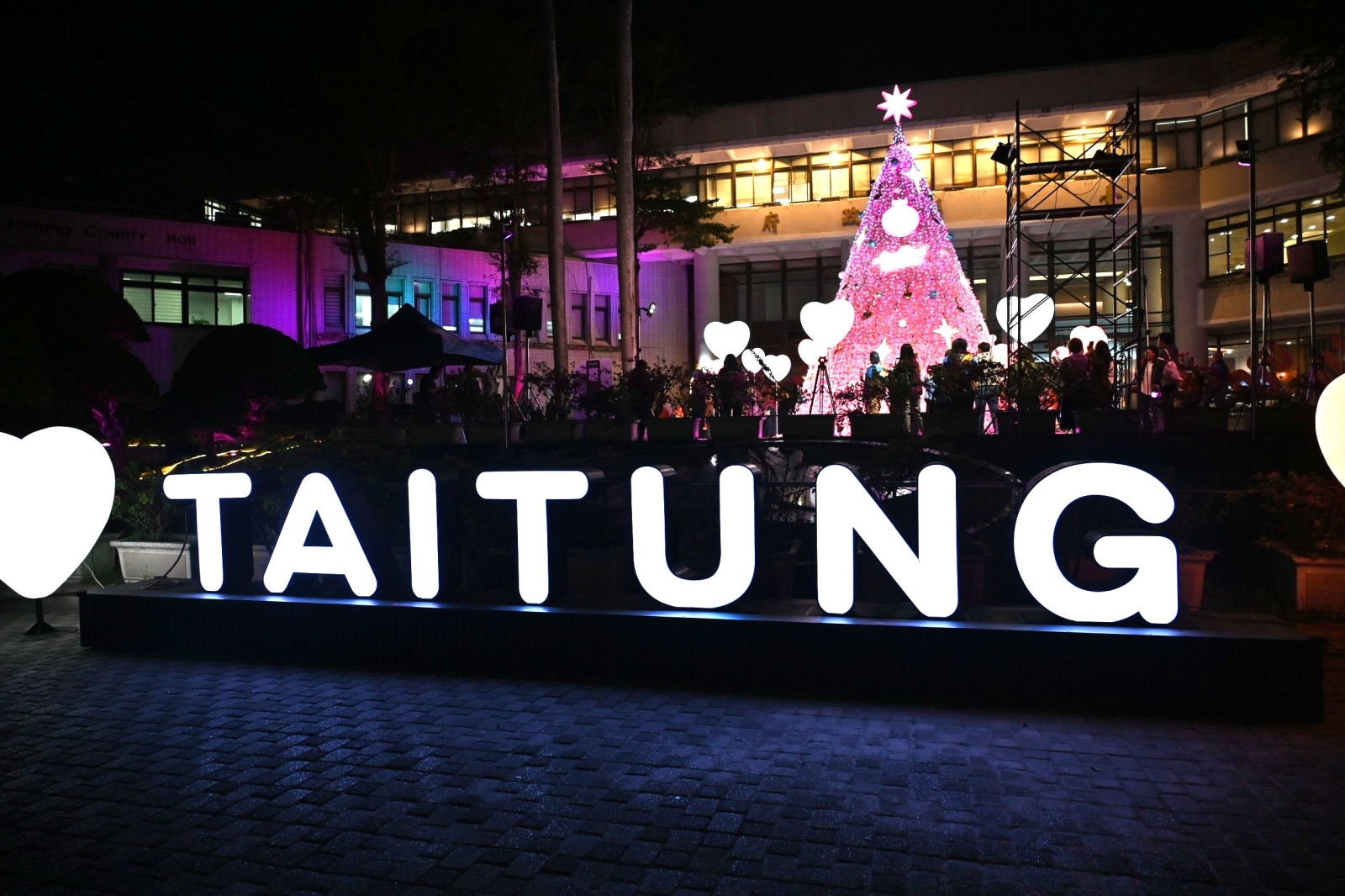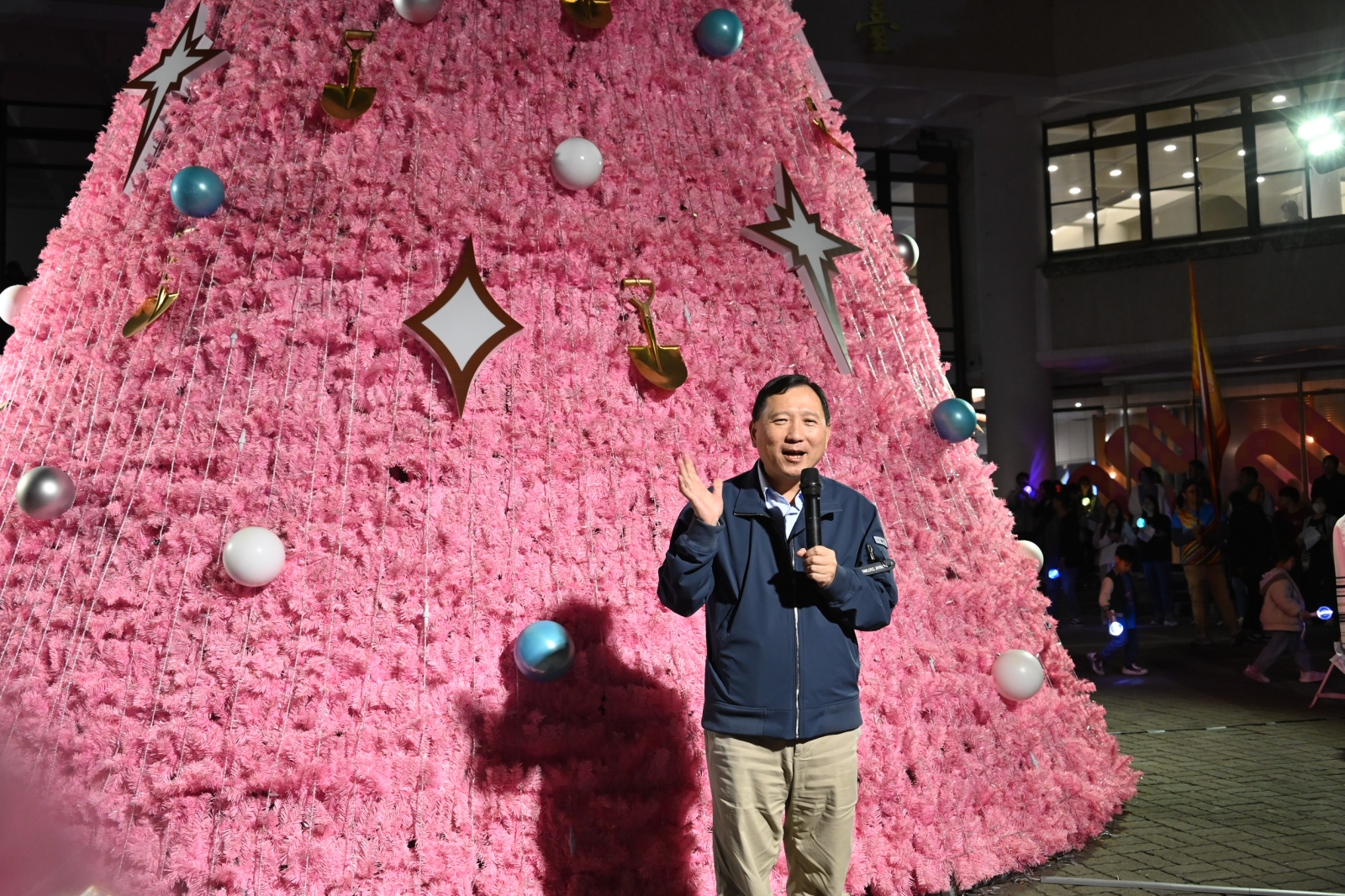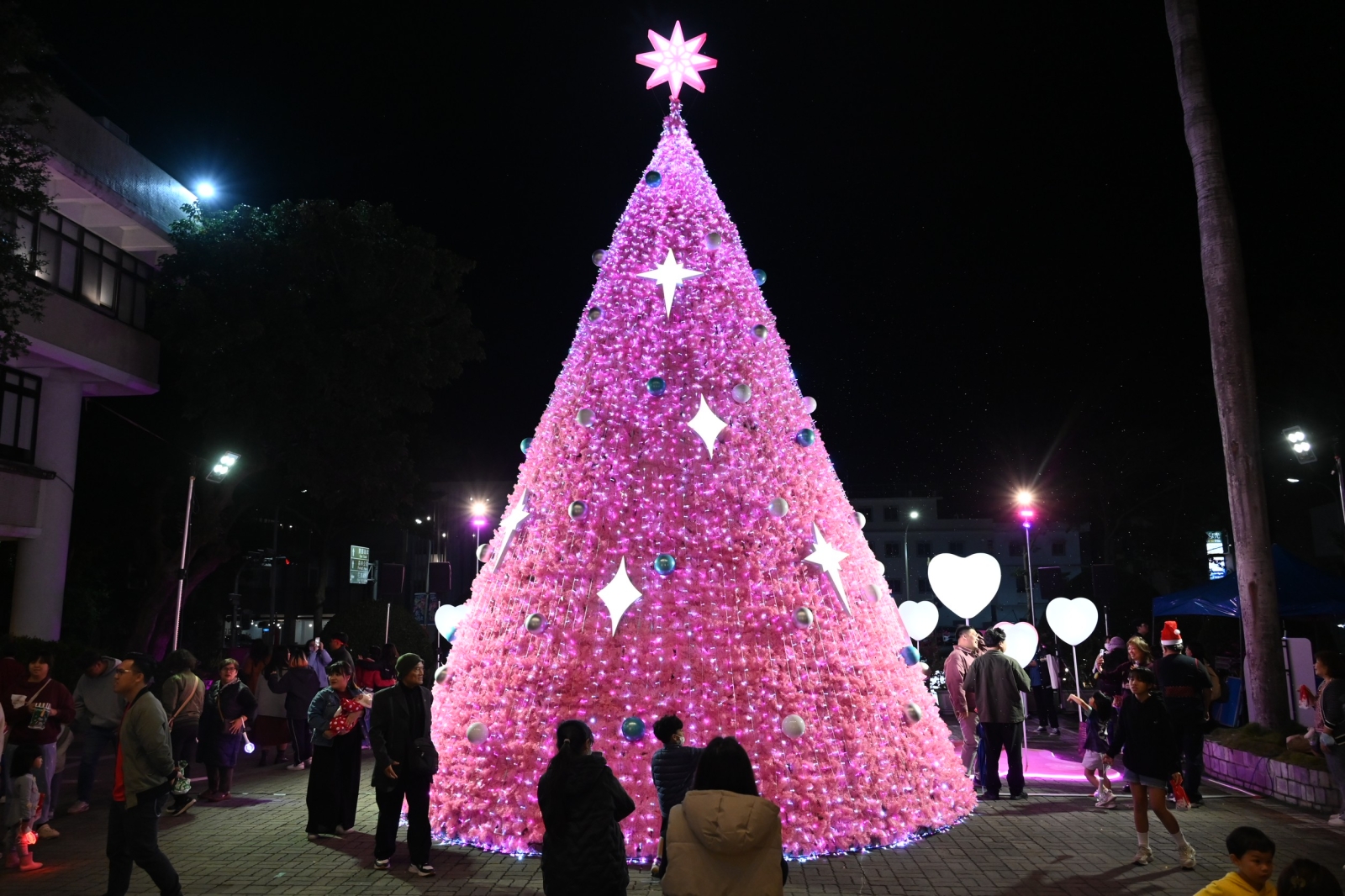 點燈活動由臺東縣聯禱會吹起號角、唱詩歌敬拜讚美揭開序幕,現場洋溢濃厚節慶氛圍。副縣長王志輝致詞時,首先向大家送上真摯的聖誕祝福。他笑說,今年縣府前廣場的粉紅聖誕樹「未演先轟動」,尚未點燈便在社群媒體掀起討論,有人聯想到「派大星」,也有人覺得像「福壽螺的卵」,其實這是被認為能安定人心,減少惡意及暴力攻擊的「貝克·米勒粉紅」,兼具邱比特浪漫與巴洛克式華麗感,打造療癒、充滿能量的視覺體驗,也傳達和平與幸福的理念。