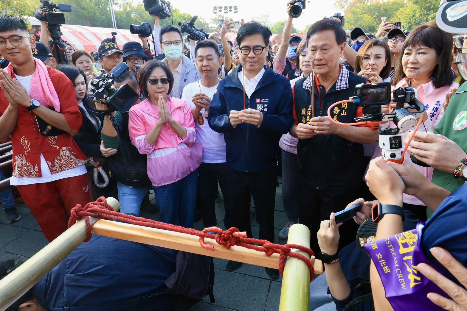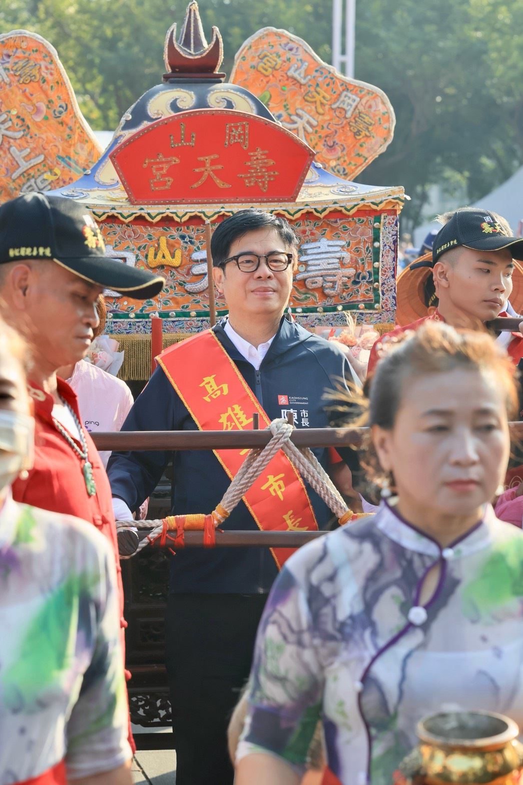 高雄市長陳其邁出席「高雄三山媽祖暨白沙屯媽祖贊境賜福遶境」活動,參香祈福並親自點燃起馬炮、扶轎起駕,恭迎聖駕巡安,祈願國泰民安、風調雨順。 圖1