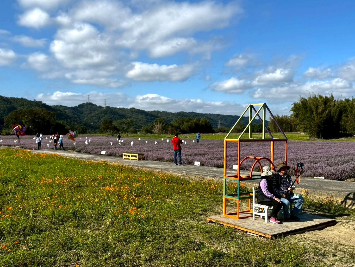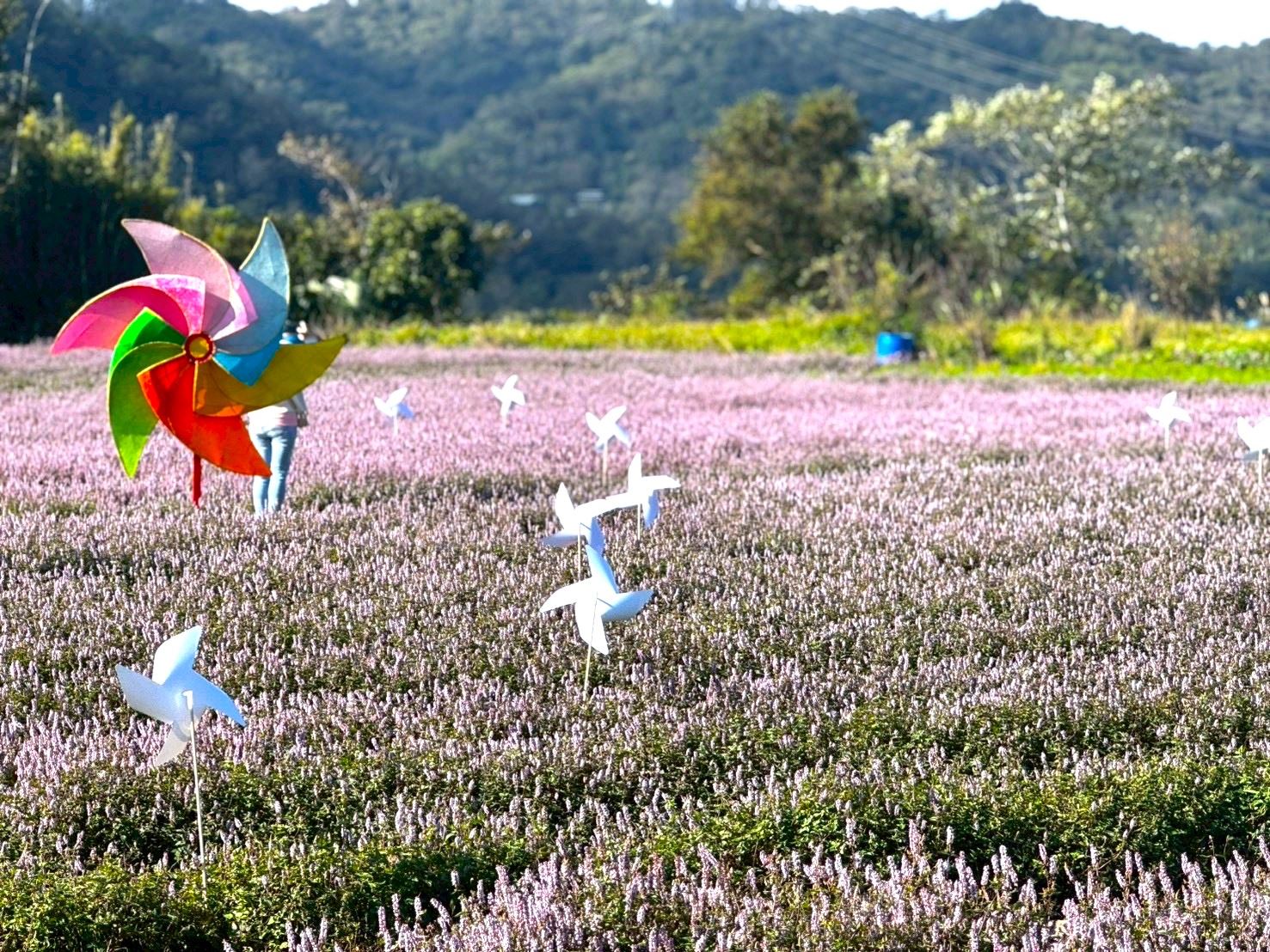 農業處表示,今年首度設置兩大主題裝置藝術,〈風吹花動〉結合風車與花田的創意構想,風起時成片風車與花朵同時搖曳,宛如流動的花之海;〈時光角落〉則位於花田中央,以木質課桌椅與積木素材搭建,呈現懷舊又童趣的「時光感」場景,彷彿把童年的教室搬進花田。