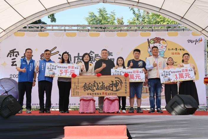 張縣長說,最受矚目的神級滷肉飯爭霸戰結果也於今日揭曉,專業店家組由大崙發哥麵店獲得本屆冠軍殊榮,民間高手組冠軍則由來自台北市的羅文澤先生獲得,現場頒發冠軍匾額及獎金;感謝食材贊助廠商包含米、醬油-西螺鎮農會、肉-雲林縣肉品市場,提供雲林最優質的米、醬、豬肉,滷肉飯的靈魂三元素,歡迎全國的民眾尋香到雲林,細細體會雲林「神級滷肉飯」的好滋味及在地食材的好品質。